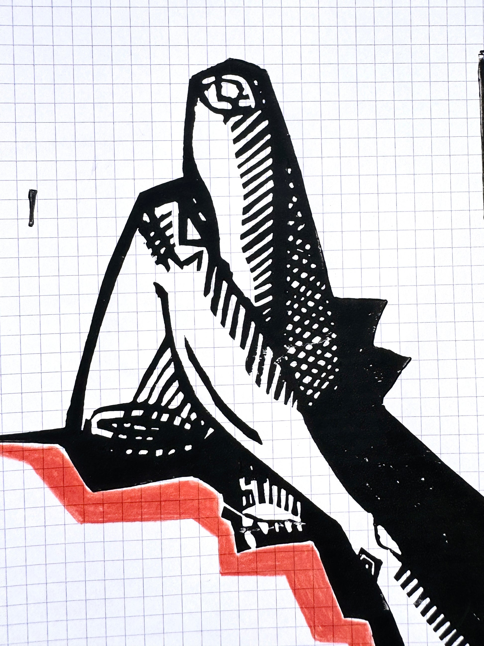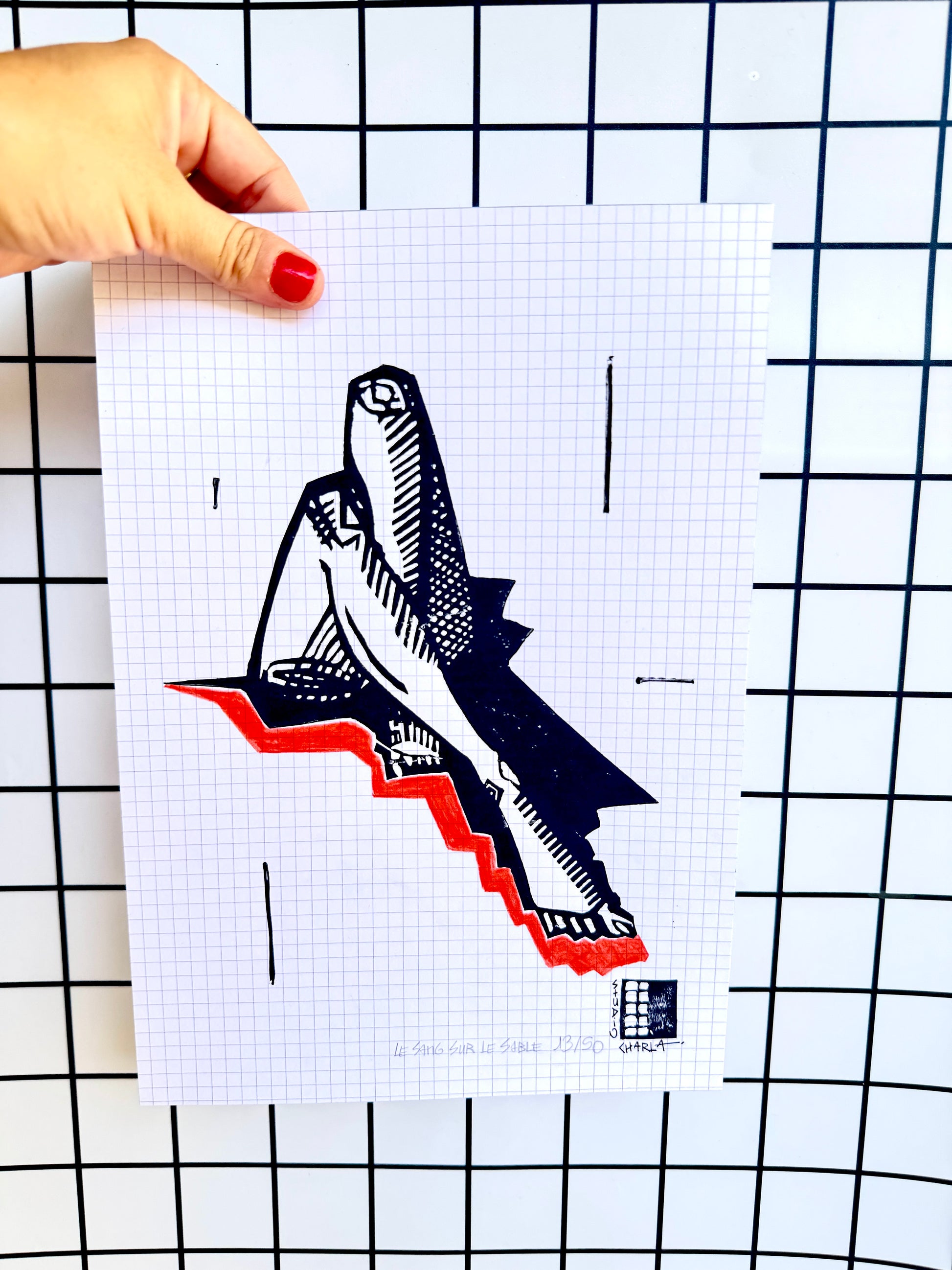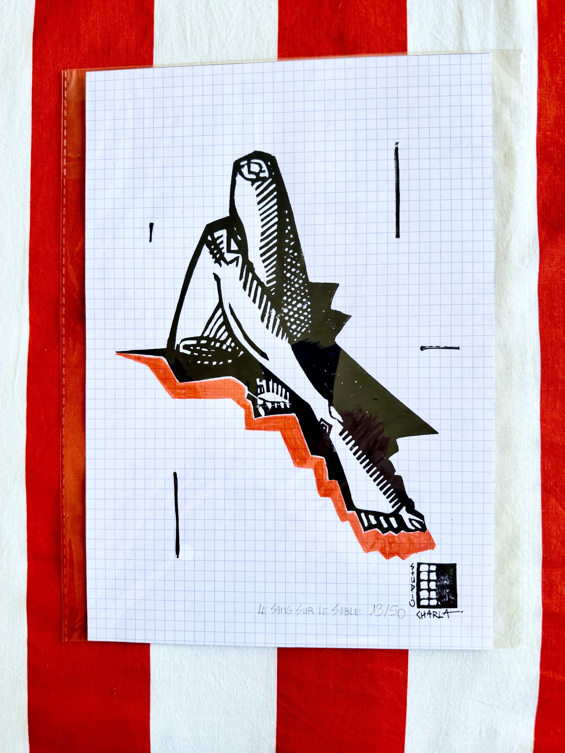 Linogravure, encre noire et crayon Posca orange sur papier lavis, A4 21 sur 29.7cm