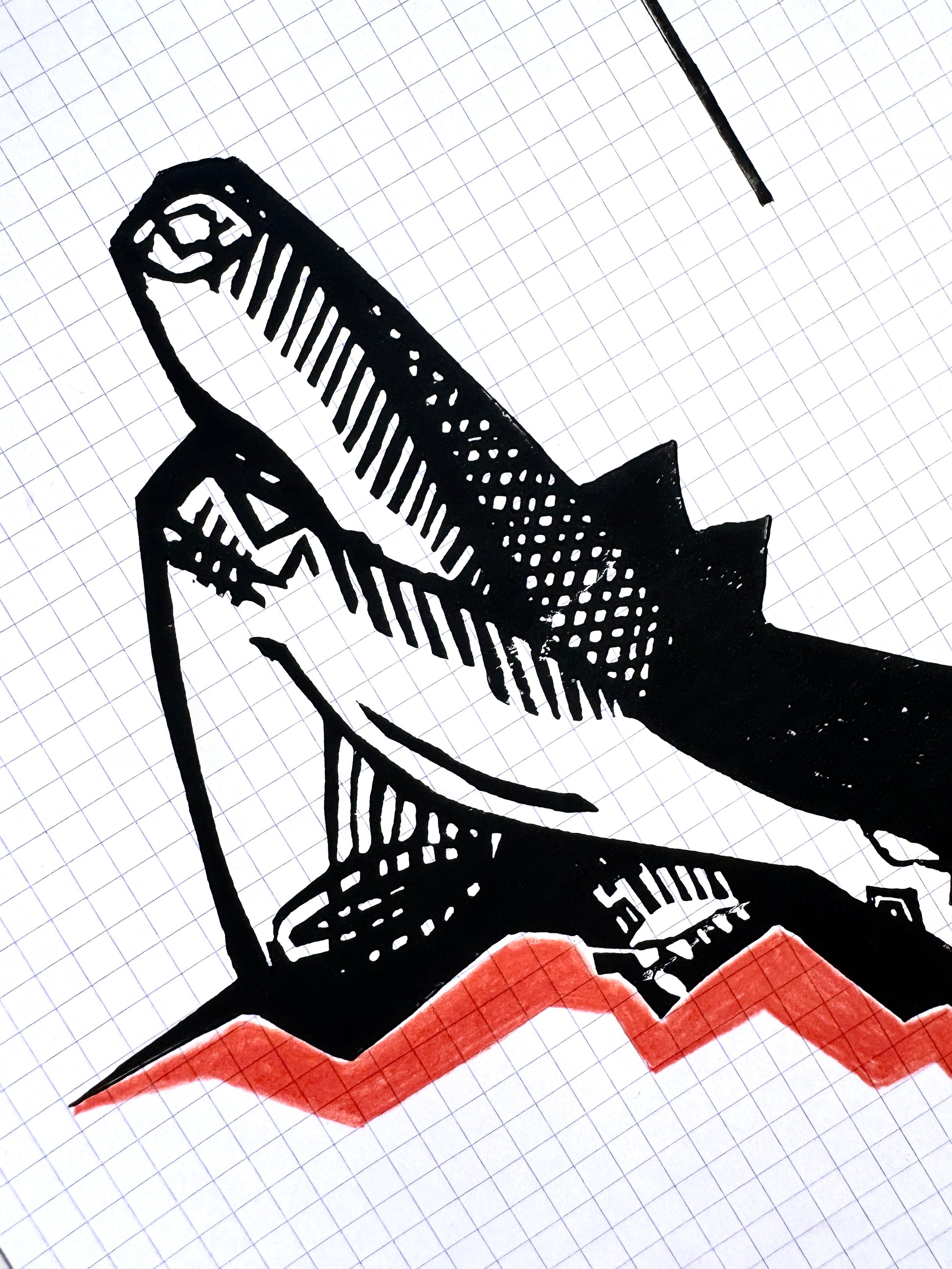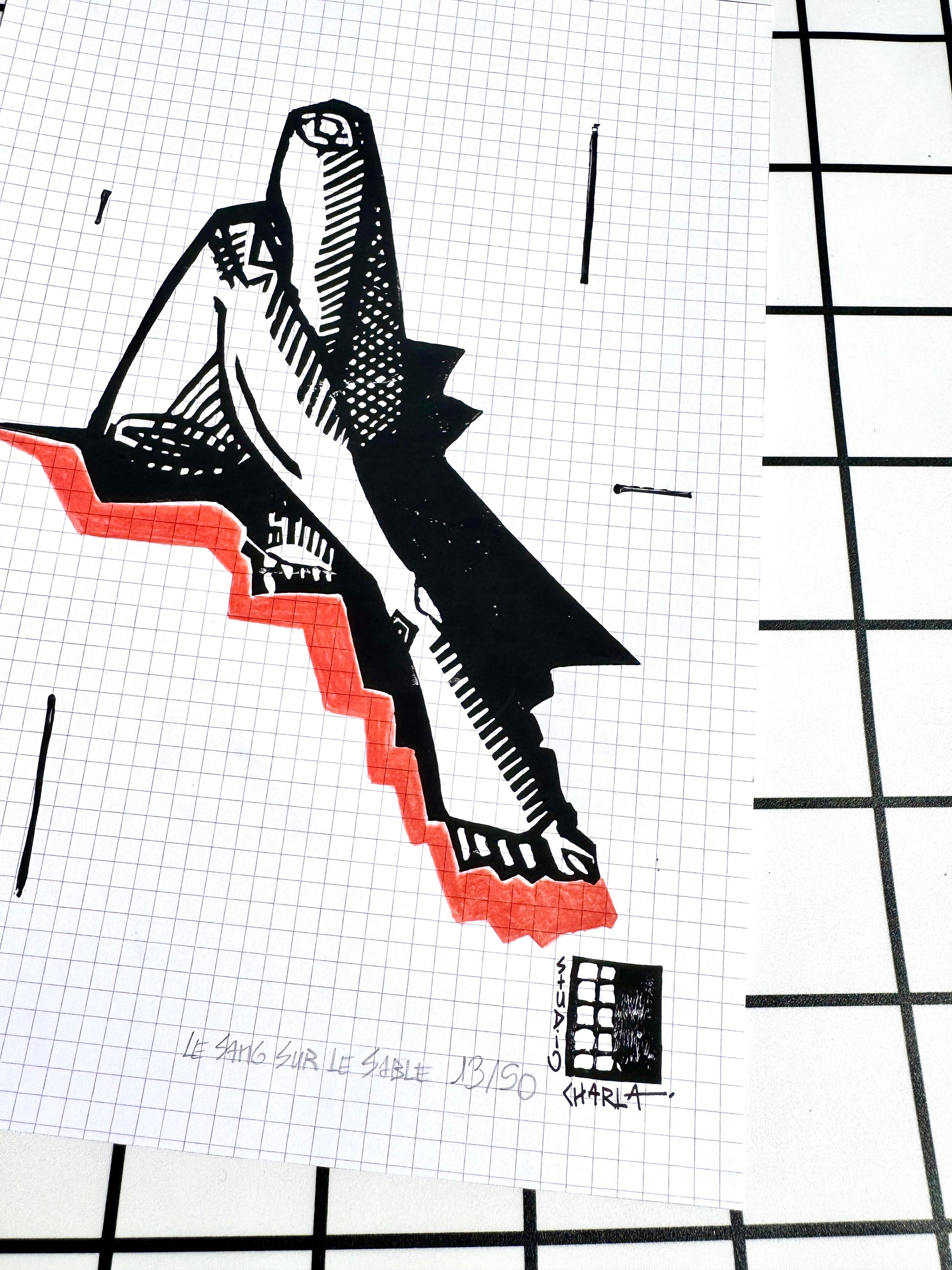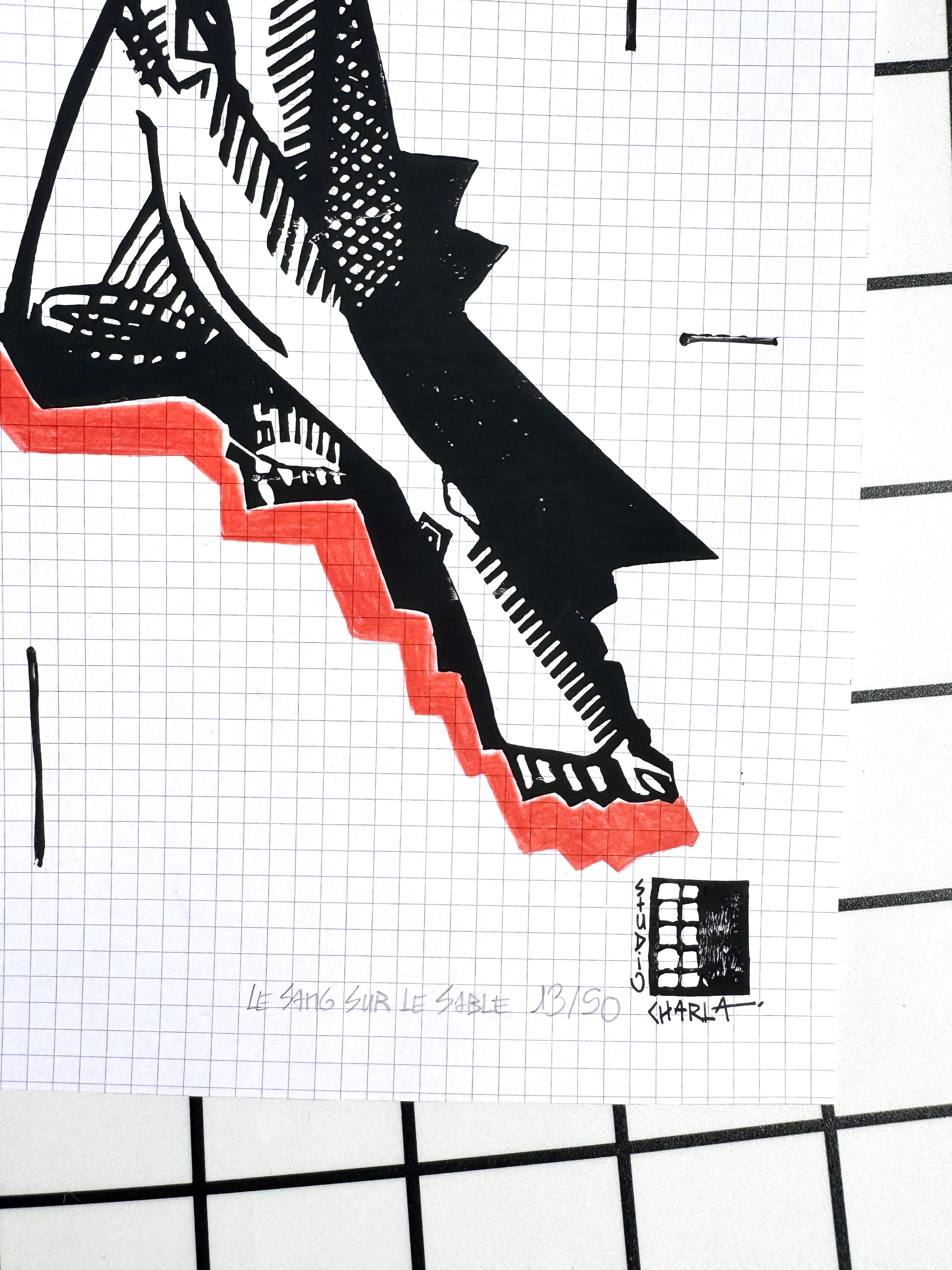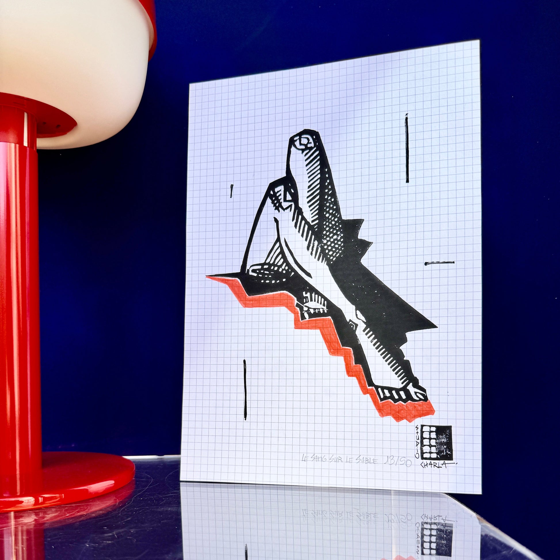 Linogravure, encre noire et crayon Posca orange sur papier lavis, A4 21 sur 29.7cm