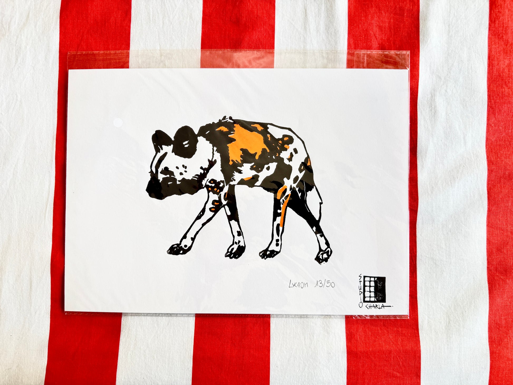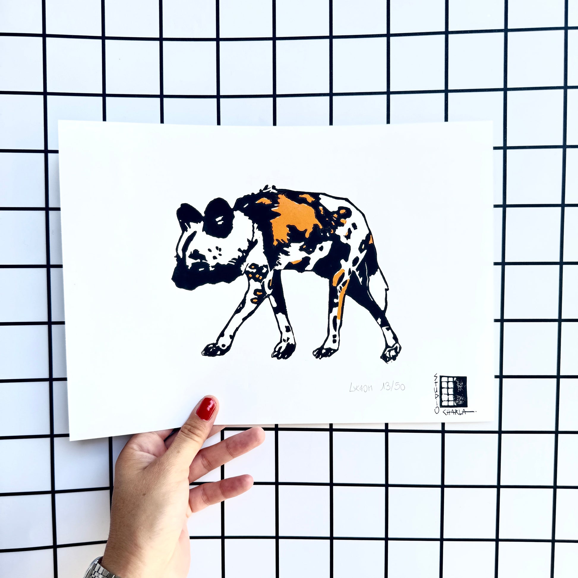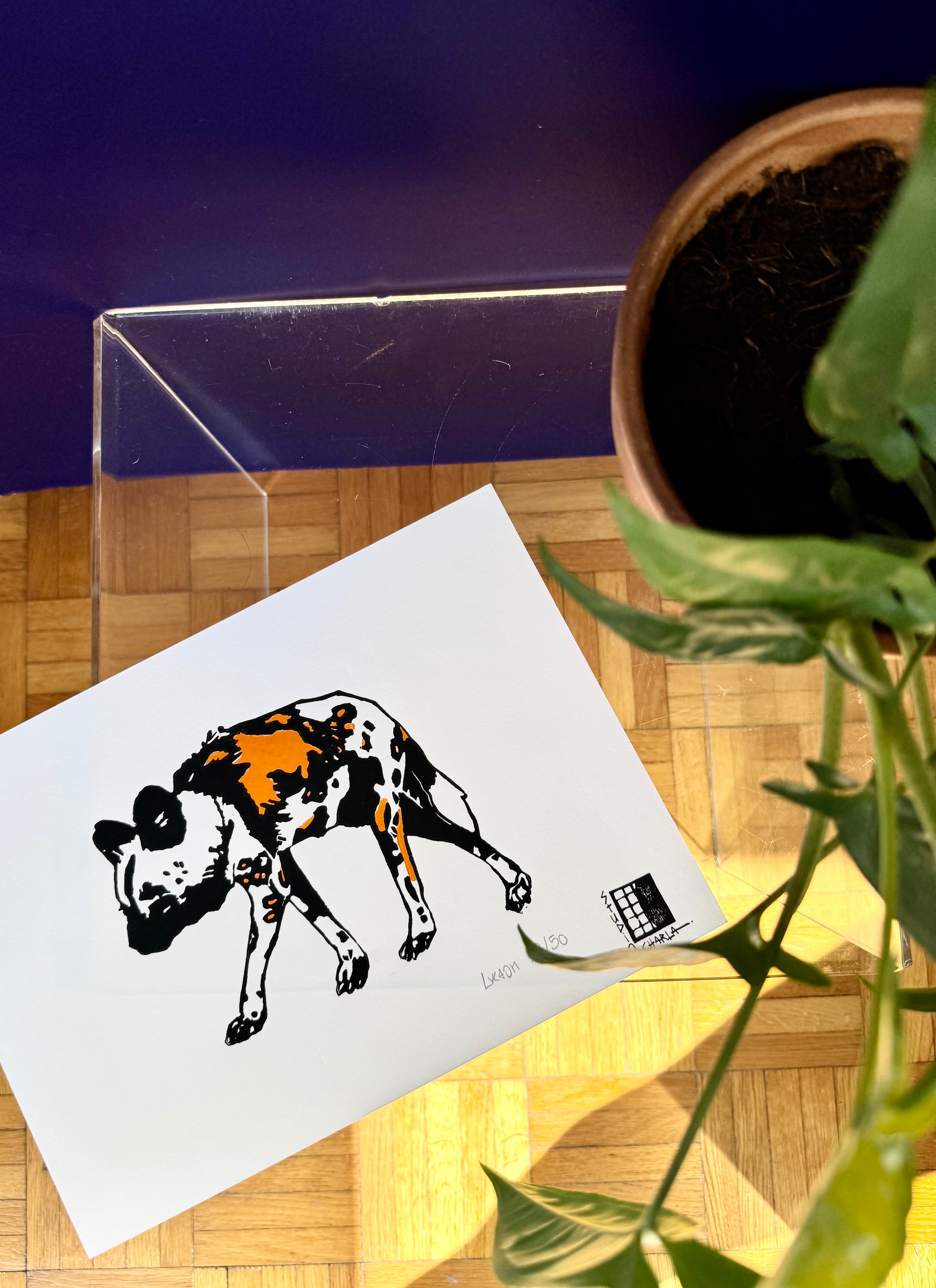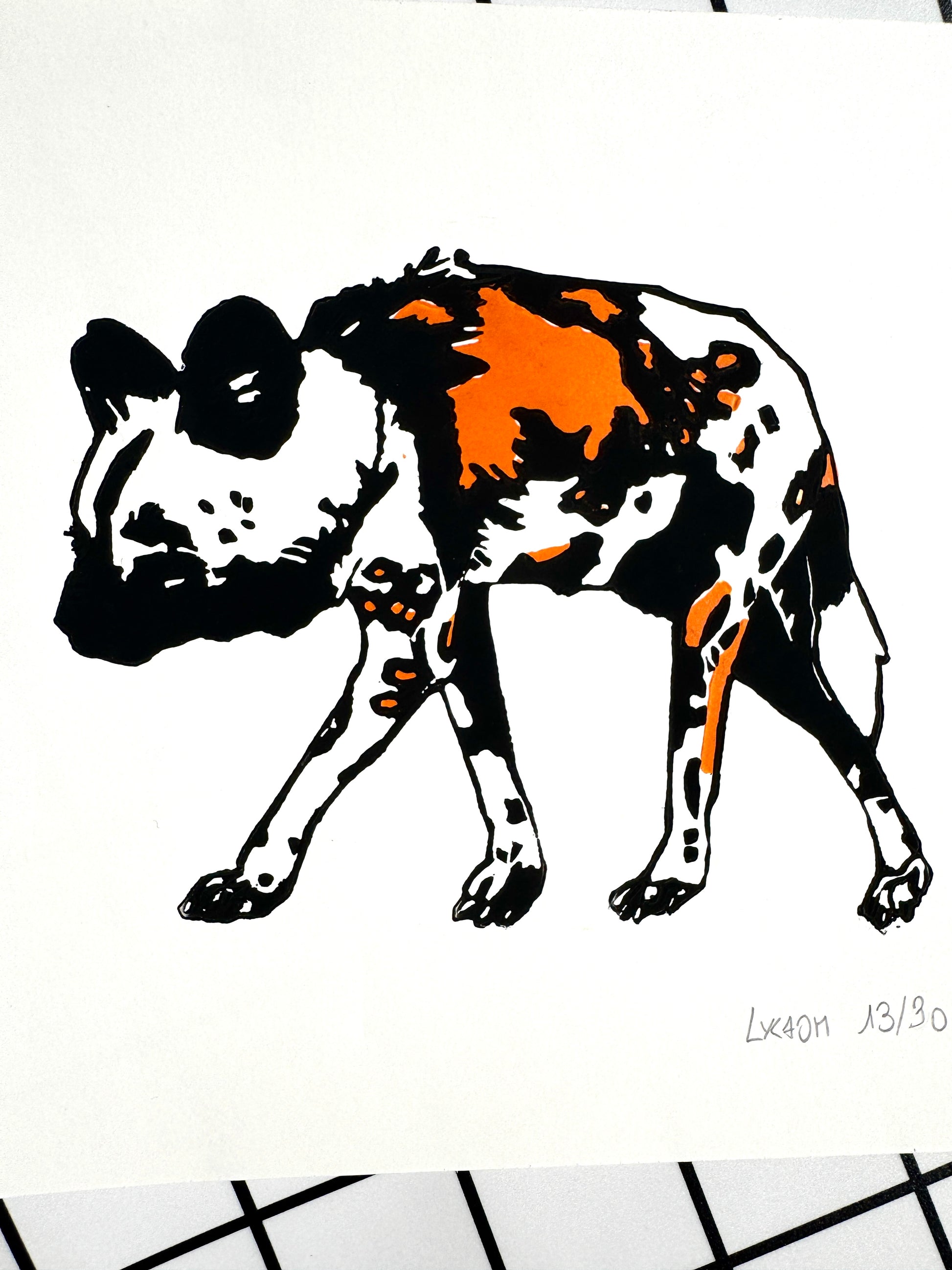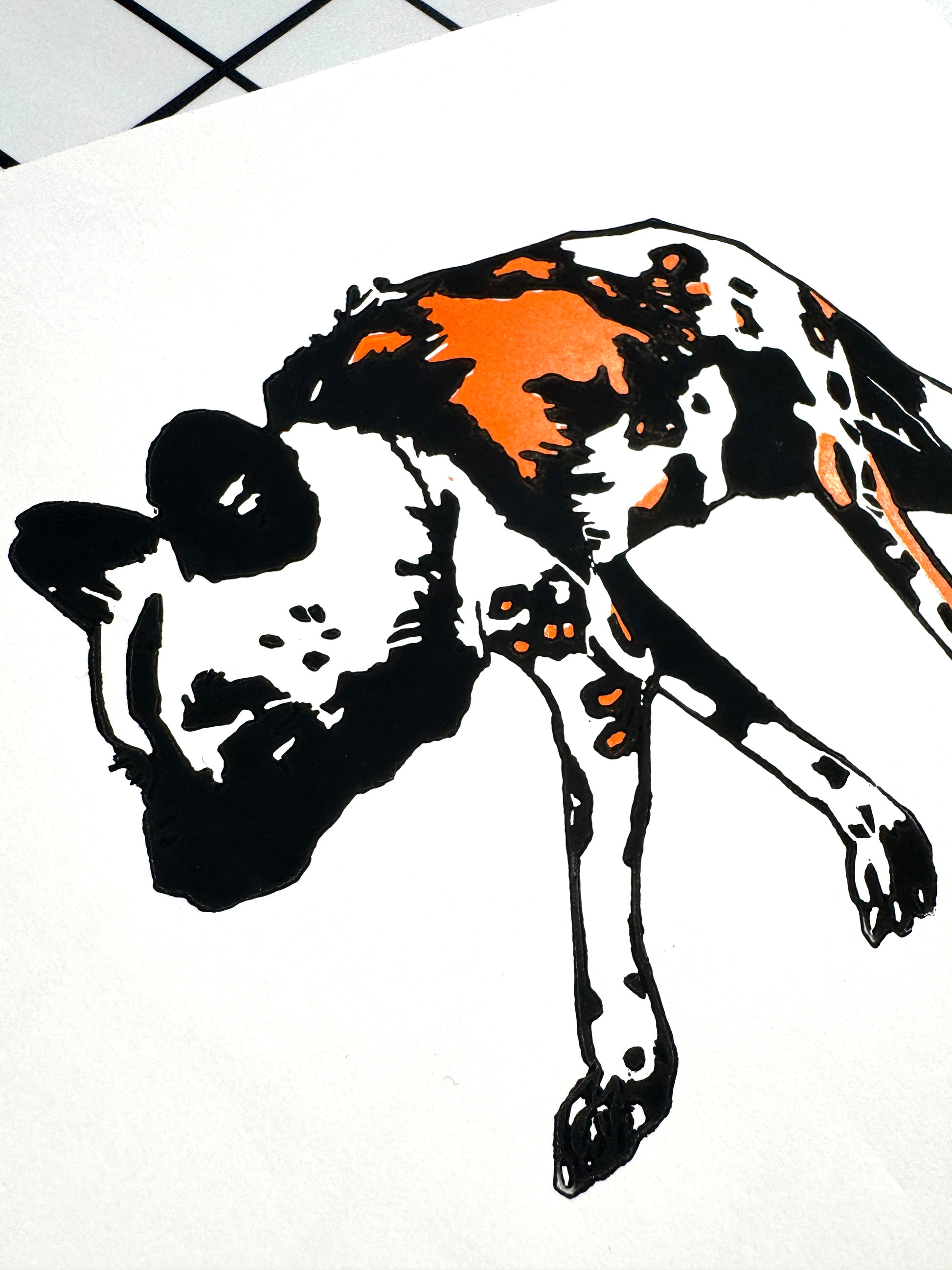 Linogravure, encres noire et orange sur papier lavis, A4 21 sur 29.7cm