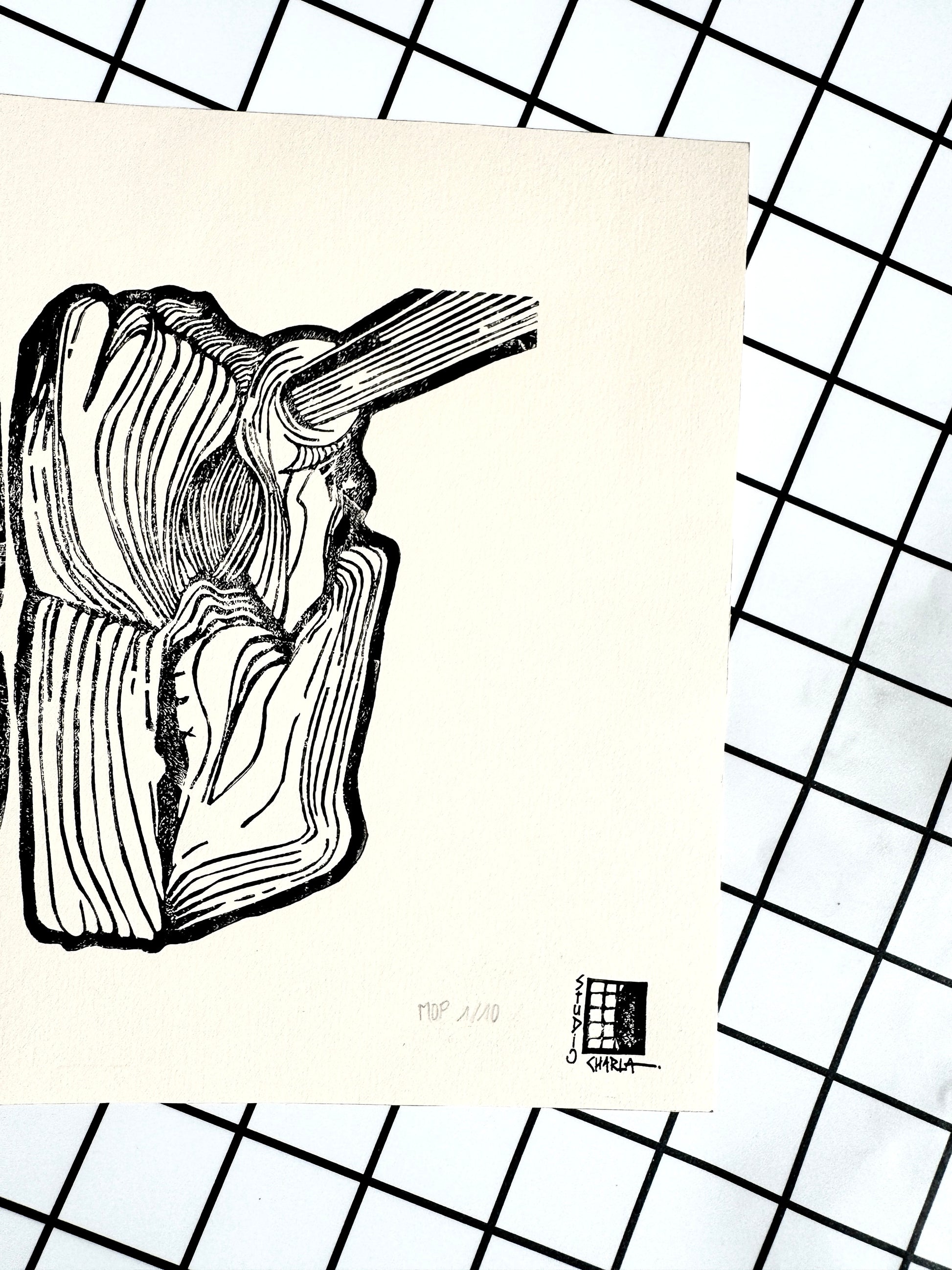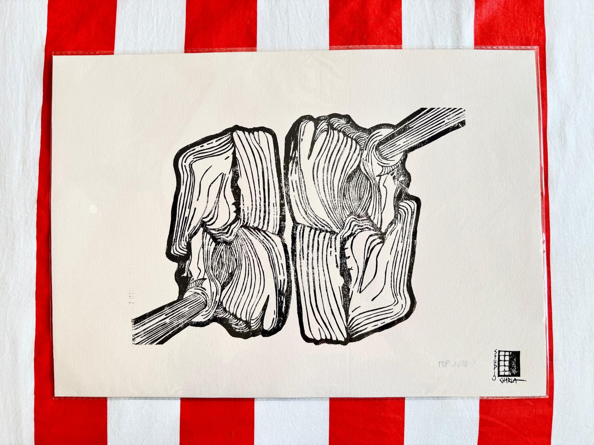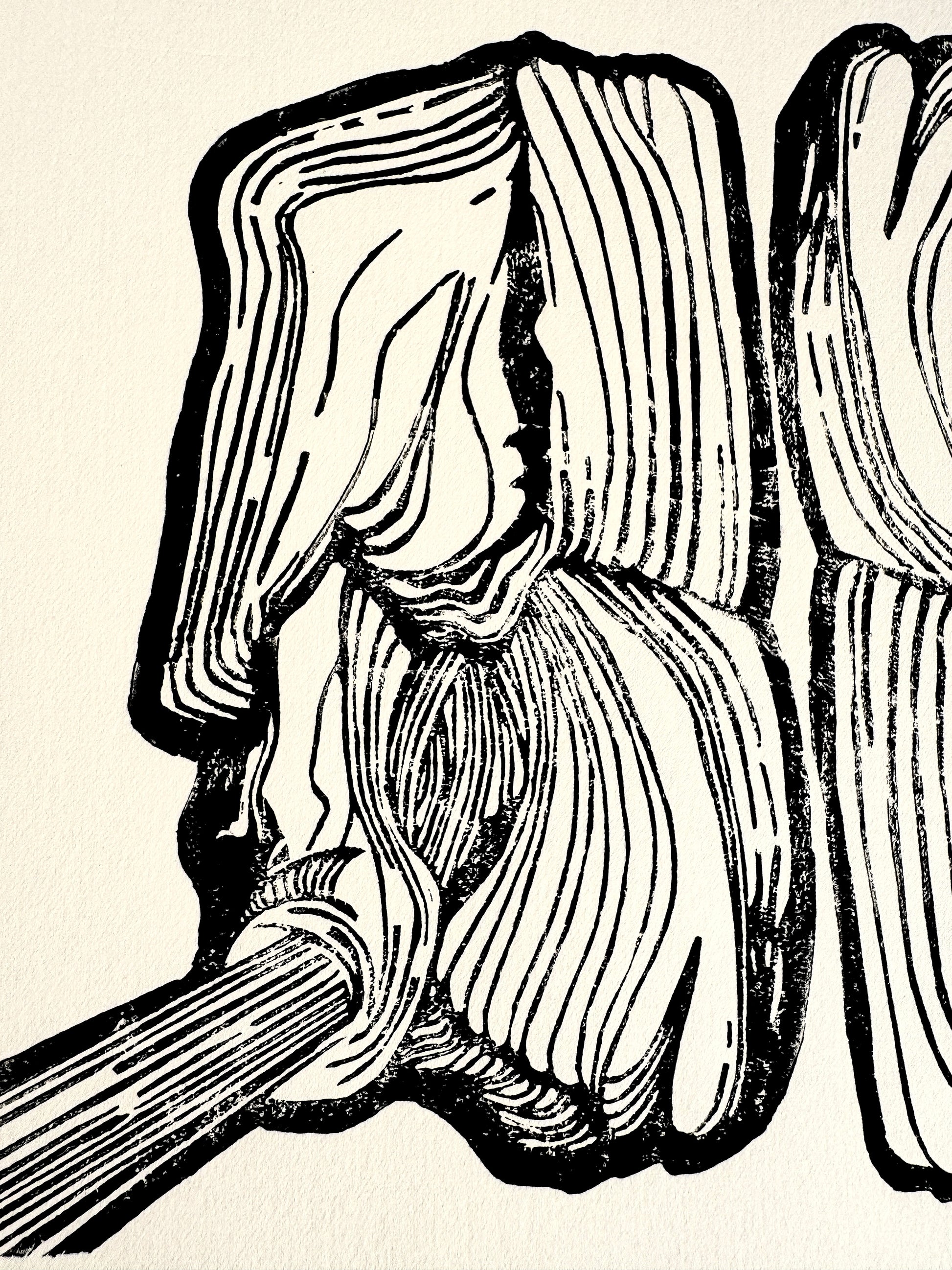 Linogravure faites main, encre noire sur papier épais blanc cassé, A3 29.7 sur 42cm