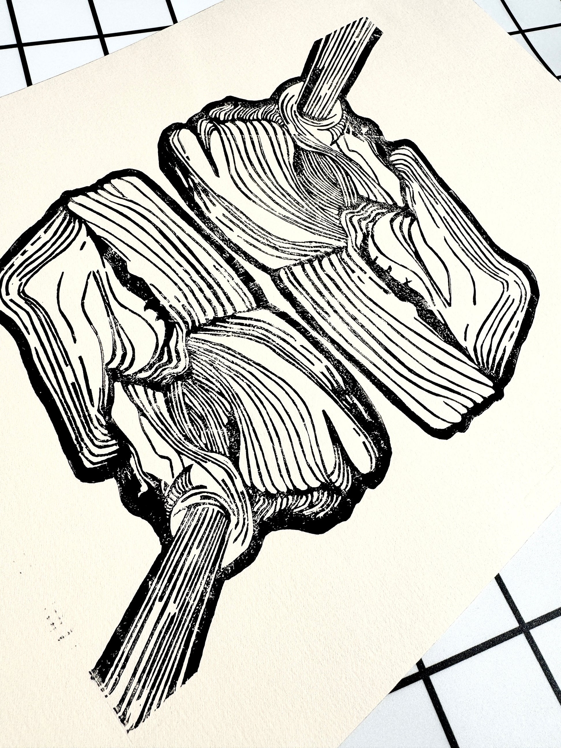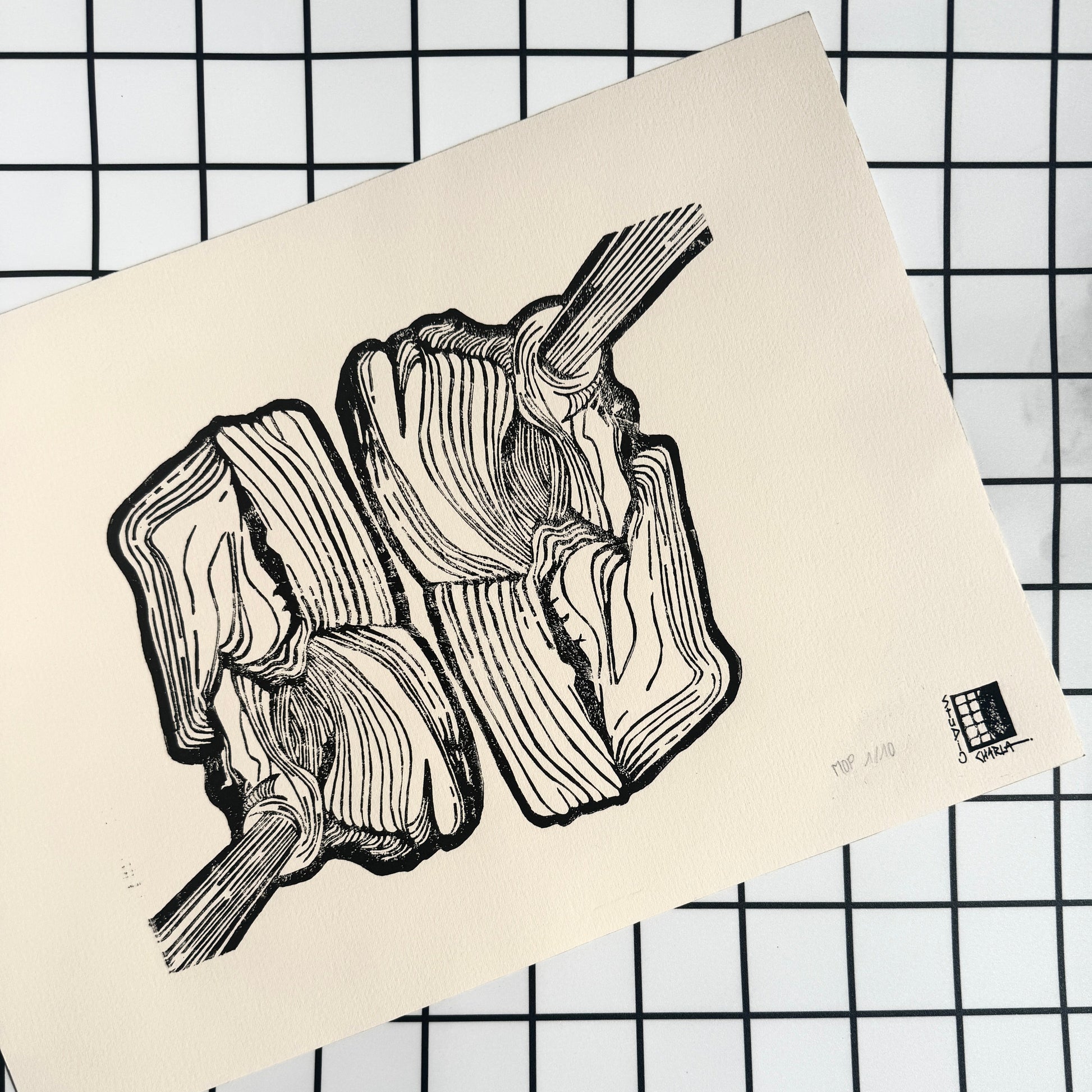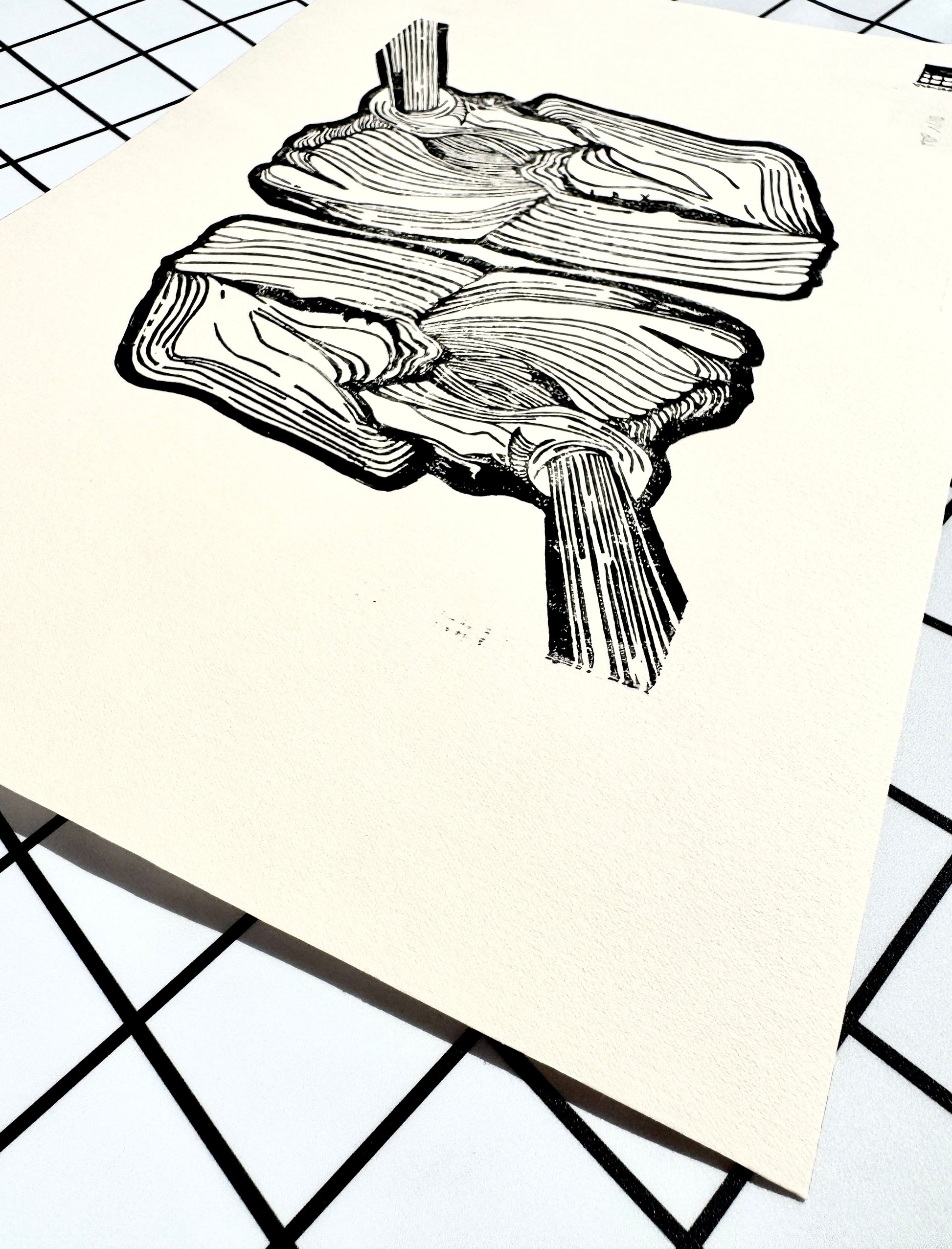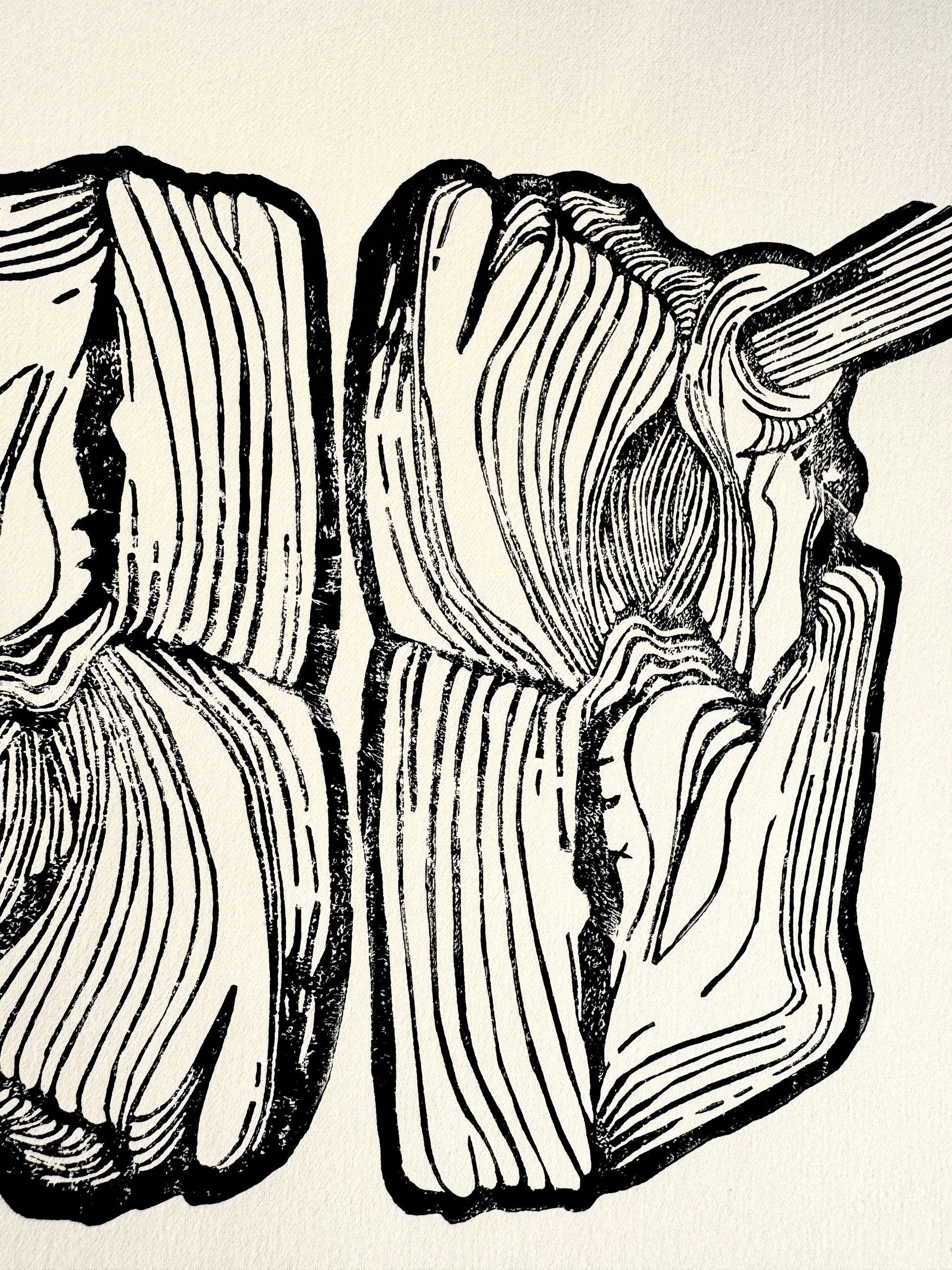 Linogravure faites main, encre noire sur papier épais blanc cassé, A3 29.7 sur 42cm