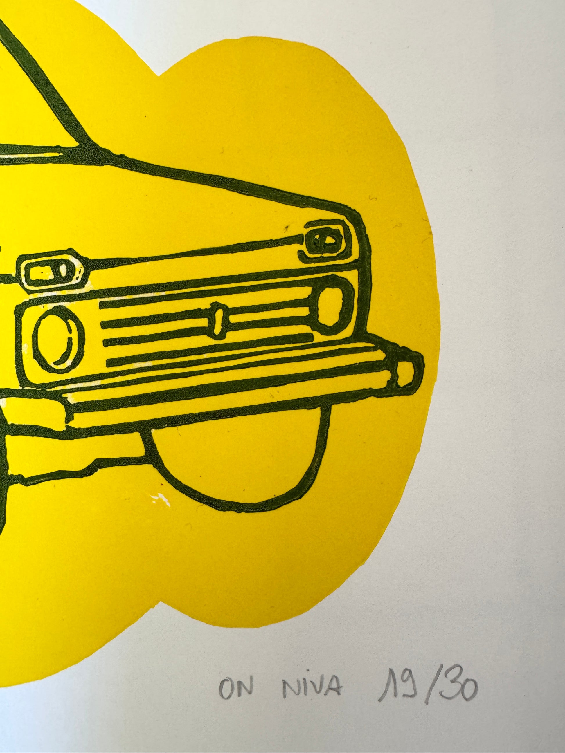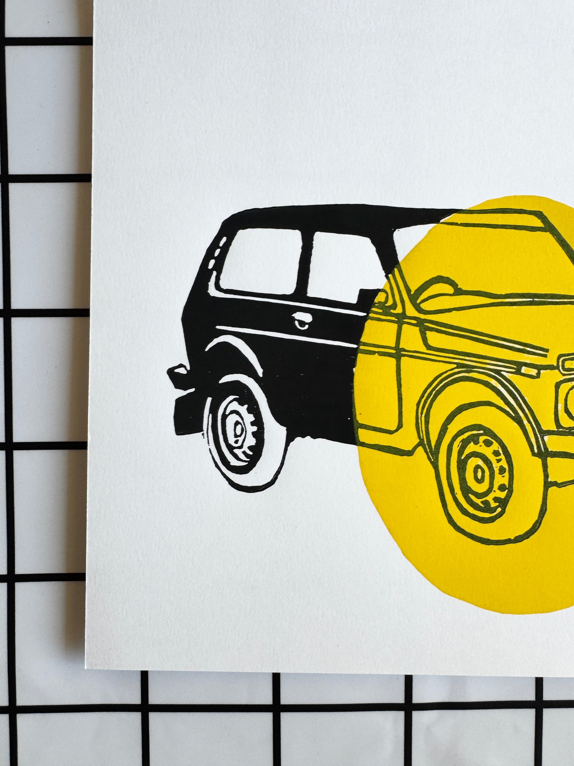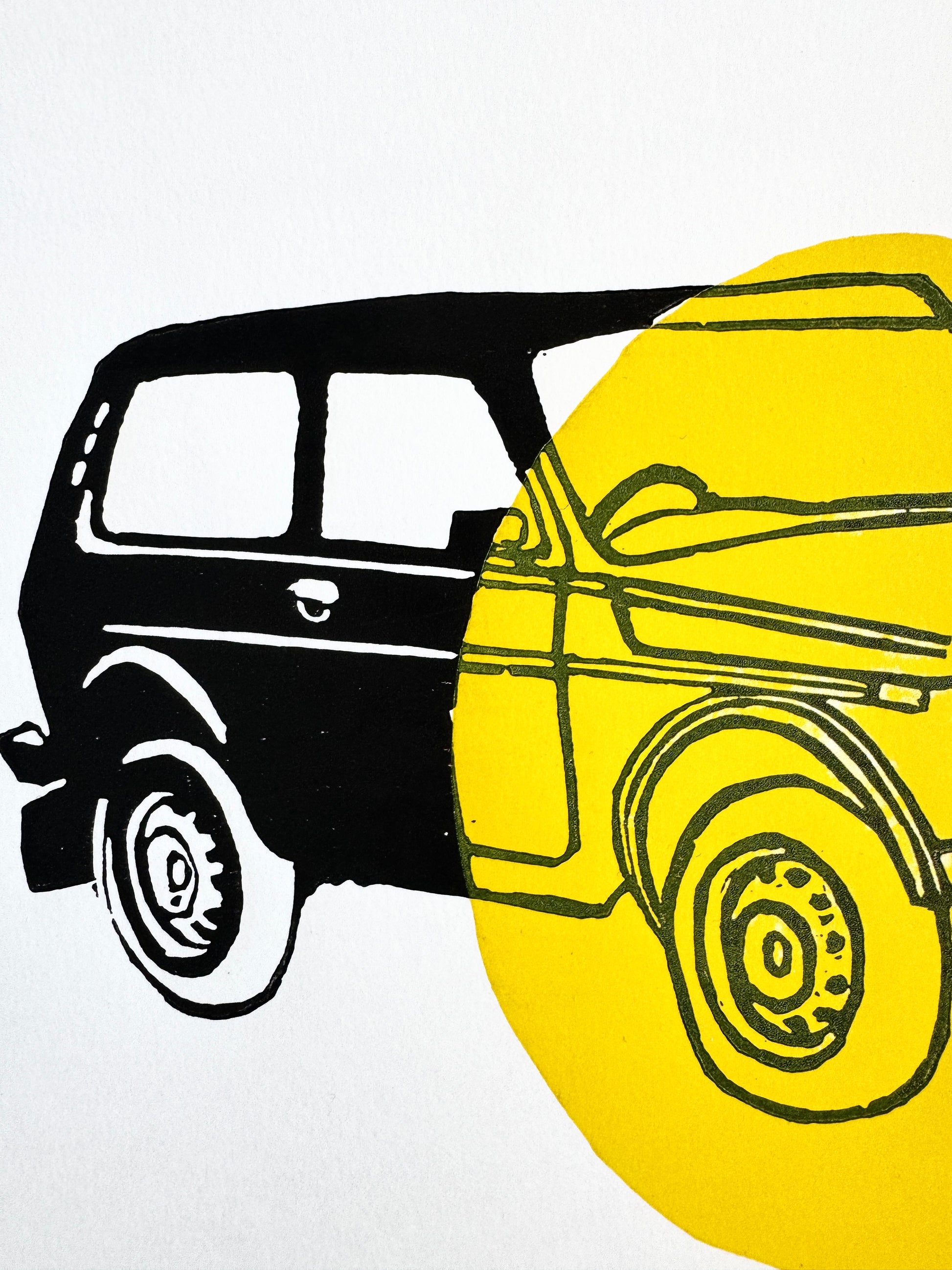 Linogravure, encres noire et jaune sur papier épais, A4 21 sur 29.7cm