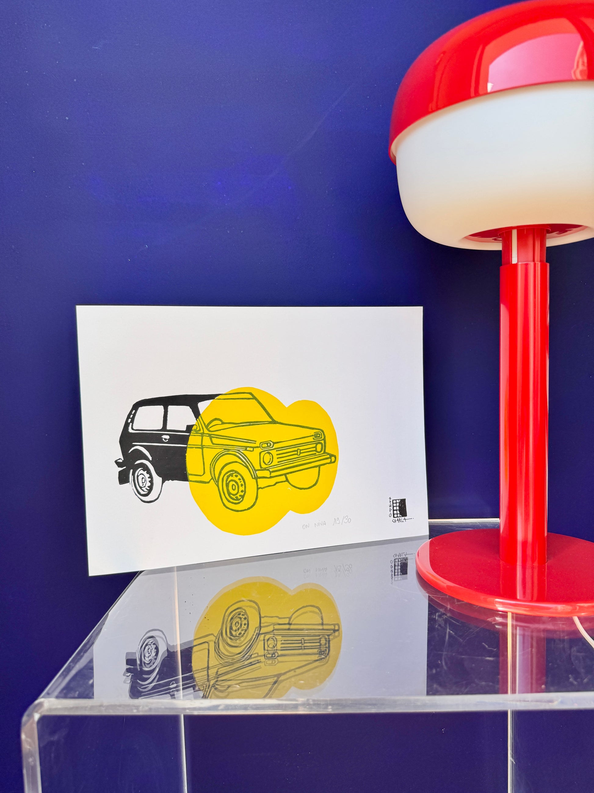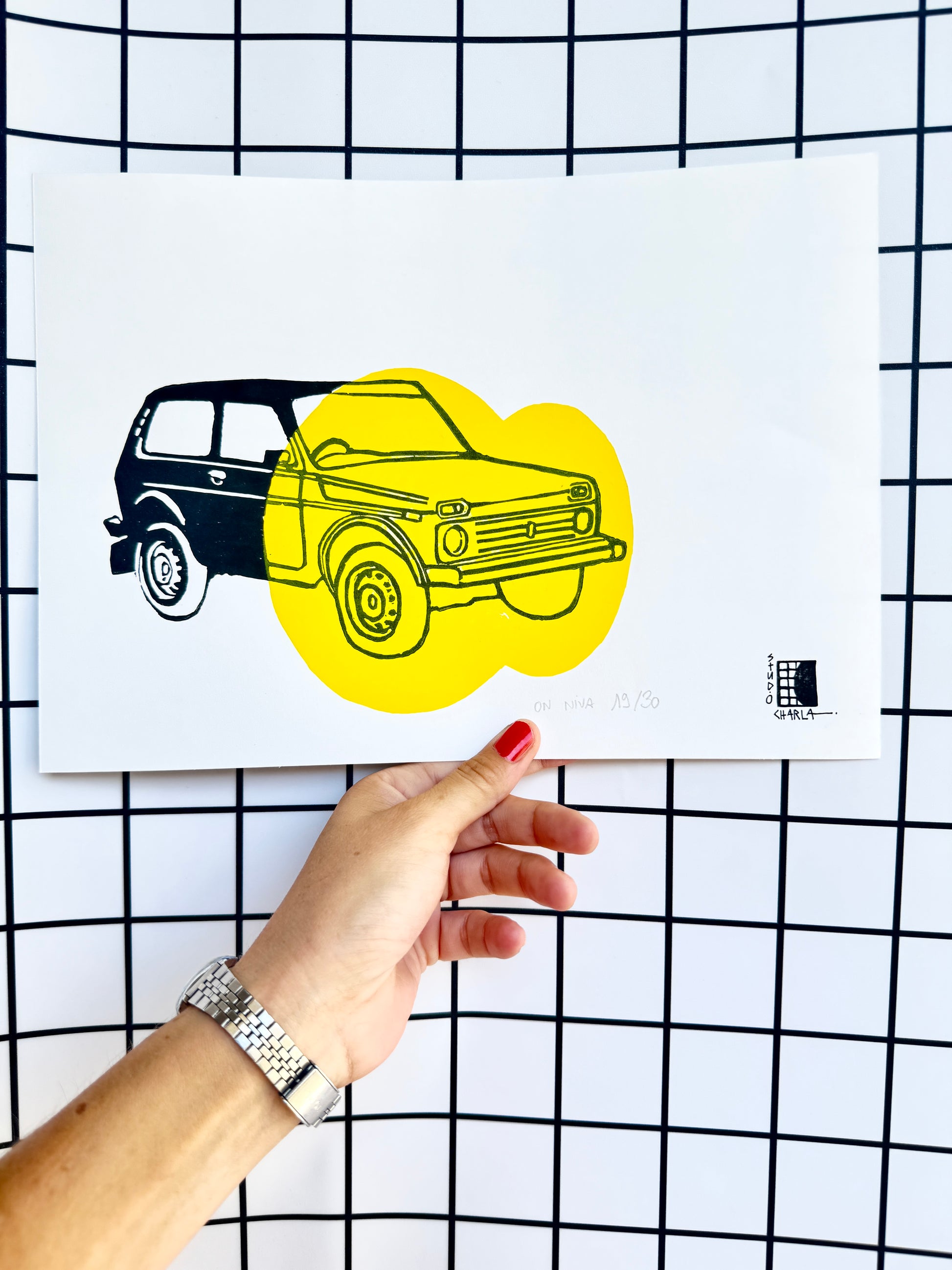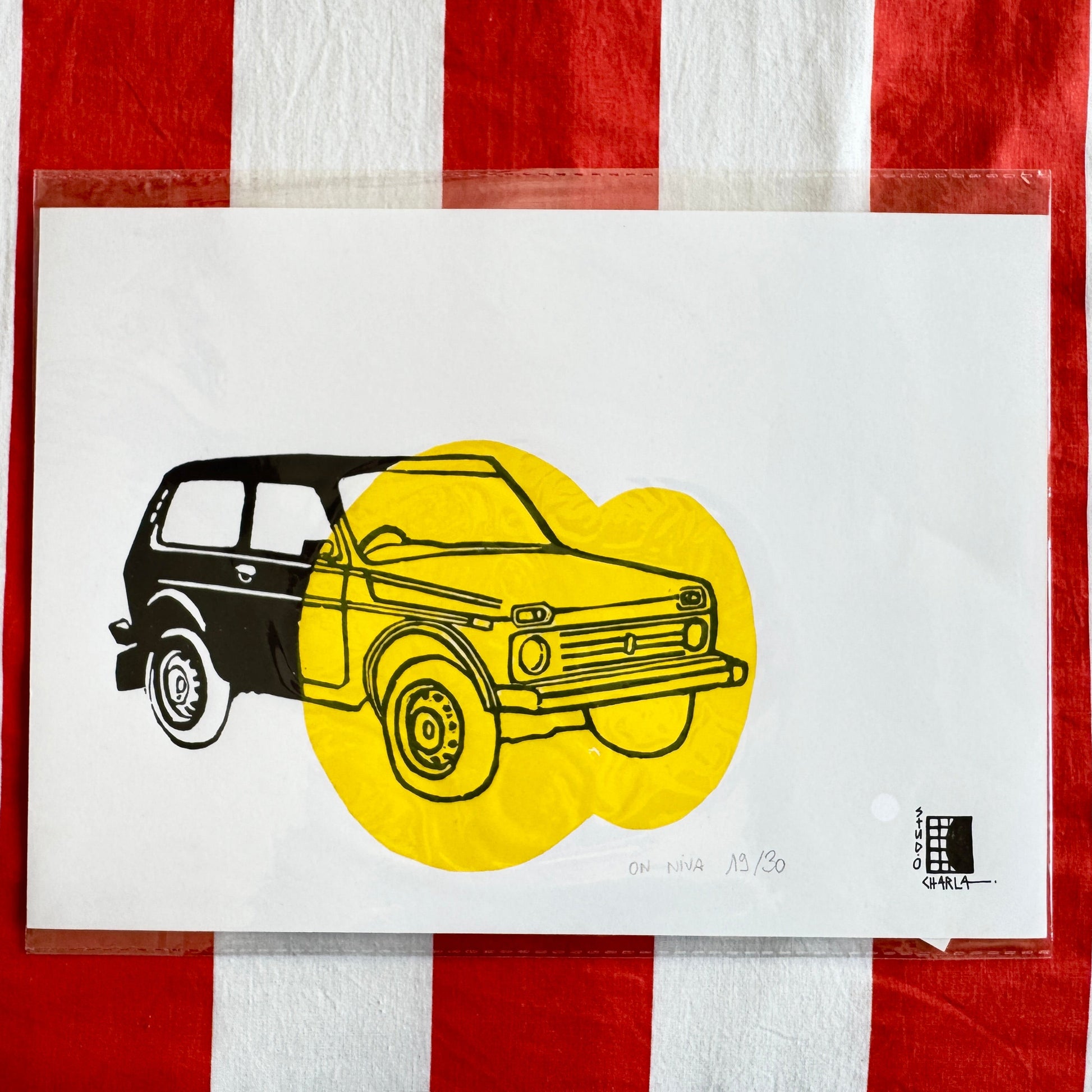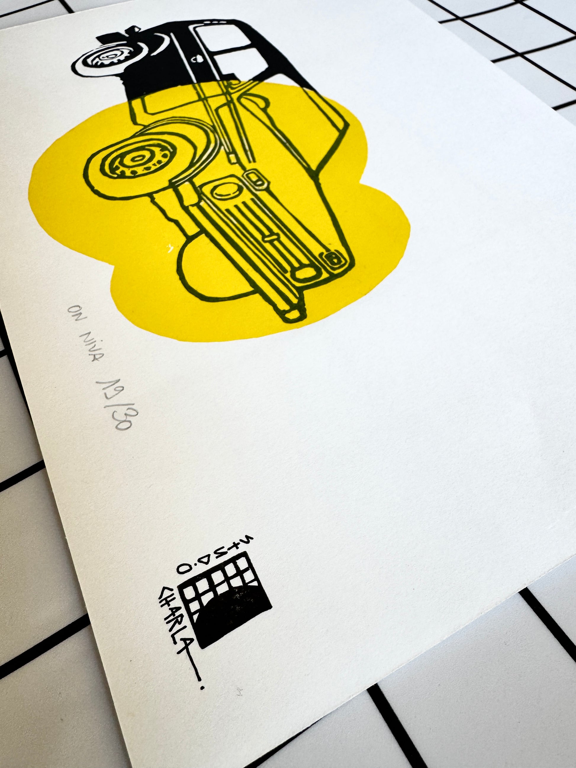 Linogravure, encres noire et jaune sur papier épais, A4 21 sur 29.7cm