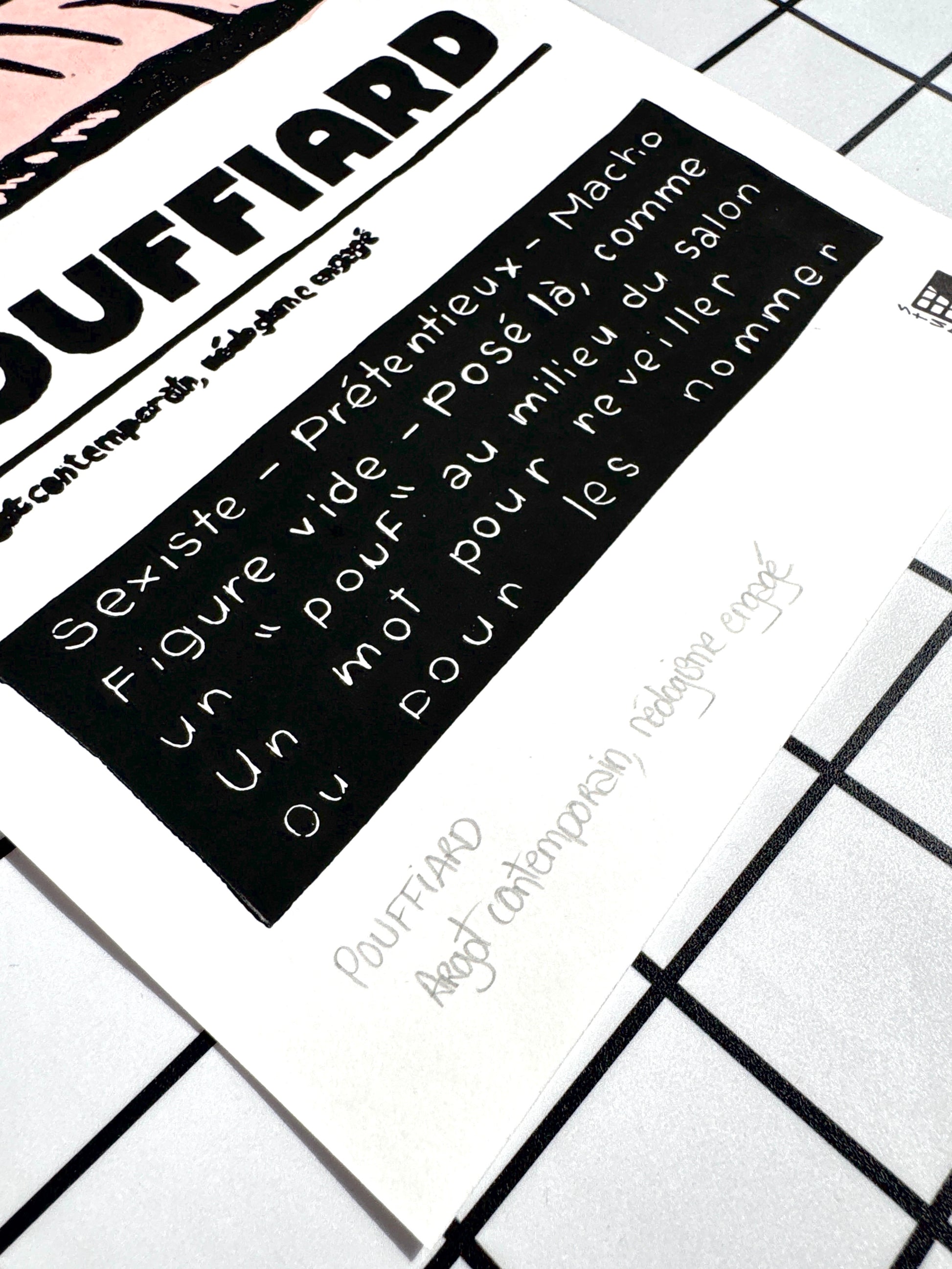 Linogravure encres noire et rose sur papier lavis, A4 21 sur 9.7 cm